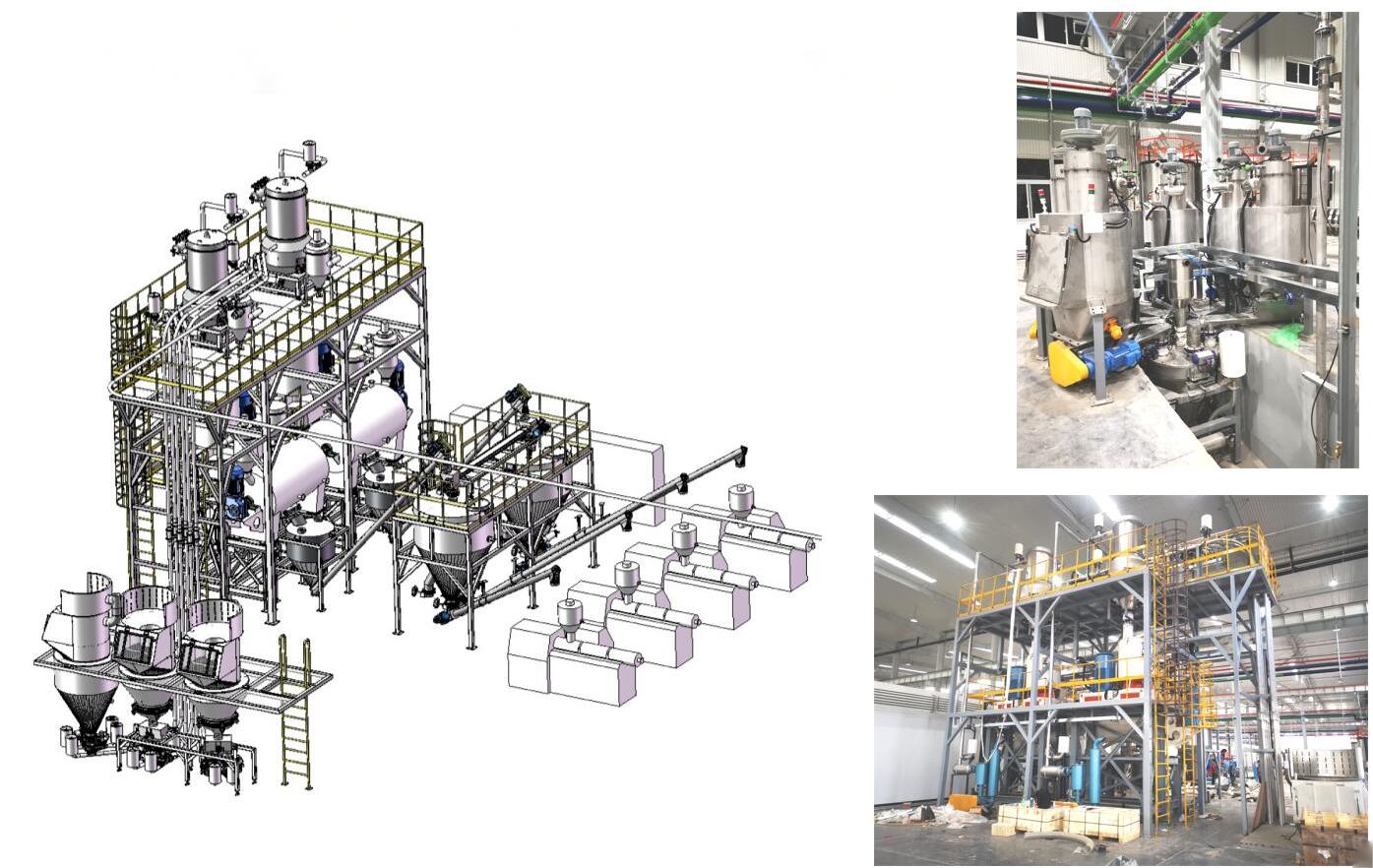 PVC、碳酸钙、辅料一楼集中投料,自动计量配混、自动混合供料、自动混料、自动筛分、自动仓储、自动挤出机供料。